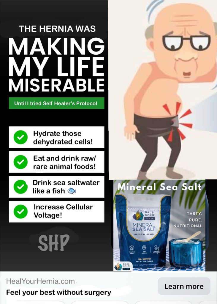 As it turns out, healing a hernia is actually very simple, to hydrate the body with water and sea salt, and also eat correctly, mostly meat, as raw as possible. Yet, the doctors will tell us the only cure for hernia is surgery. Surely the medical schools would know this, what am I smarter than the hospitals? It would seem so. Either that or they are corrupted to the core/dishonest/criminal and they have no interest in our health.